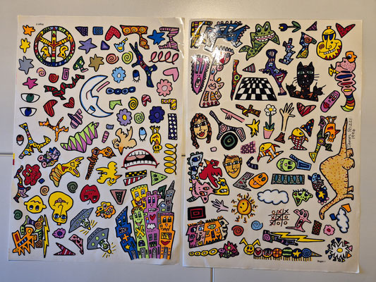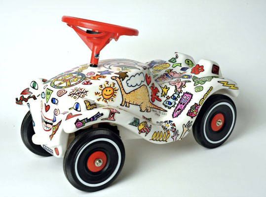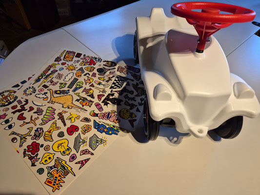 Angeboten wird hier ein Original James Rizzi Bobby-Car-Aufklebersatz aus dem Jahr 1996 zuzüglich einem passenden weißen Bobby-Car.
