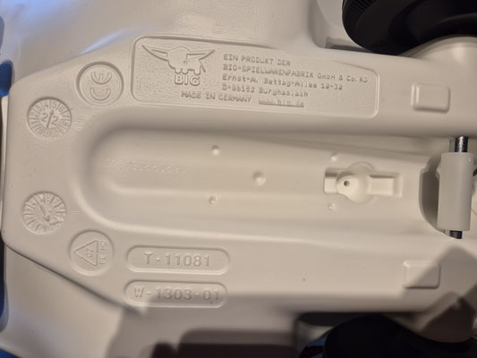 Das dazugehörige Bobby-Car ist wie neu und unbenutzt/unbespielt. Es ist neueren Datums. Es stammt aus dem Jahr 2022 und kam so nie in den Handel, da es lediglich in einer kleinen limitierten Auflage für besondere Aktionen/Veranstaltungen hergestellt wurde. Bei diesem Bobby-Car handelt es sich also auch um eine Rarität und es entspricht fast zu 100% dem weißen BIG-Bobby-Car-Classic, welches 1996 zusammen mit dem James Rizzi Aufklebersatz in den Handel kam.